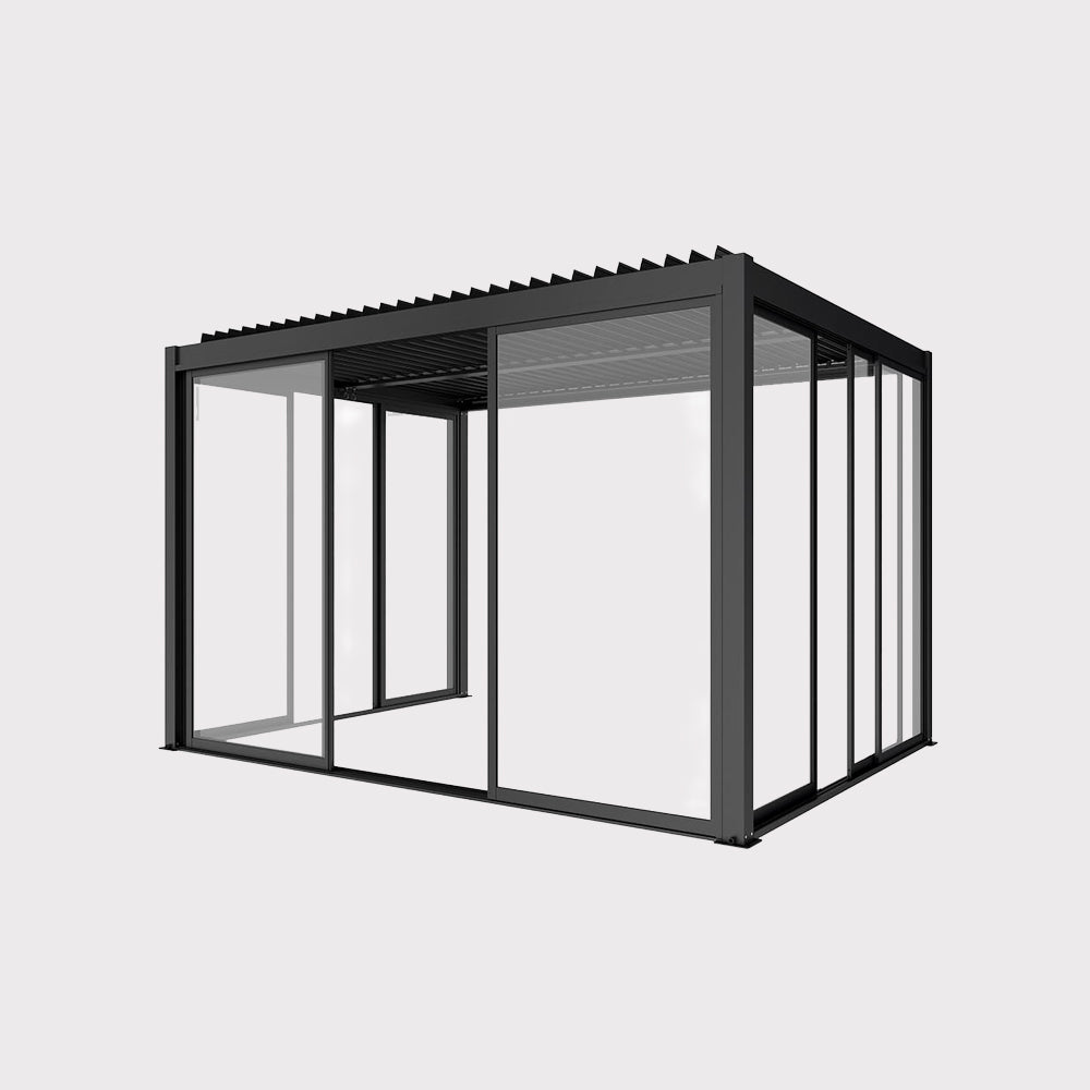Drzwi przesuwne z aluminium i szkła hartowanego pozwalają w pełni zabudować pergolę Luxe i elastycznie regulować otwartą przestrzeń dzięki trzem skrzydłom na prowadnicach.