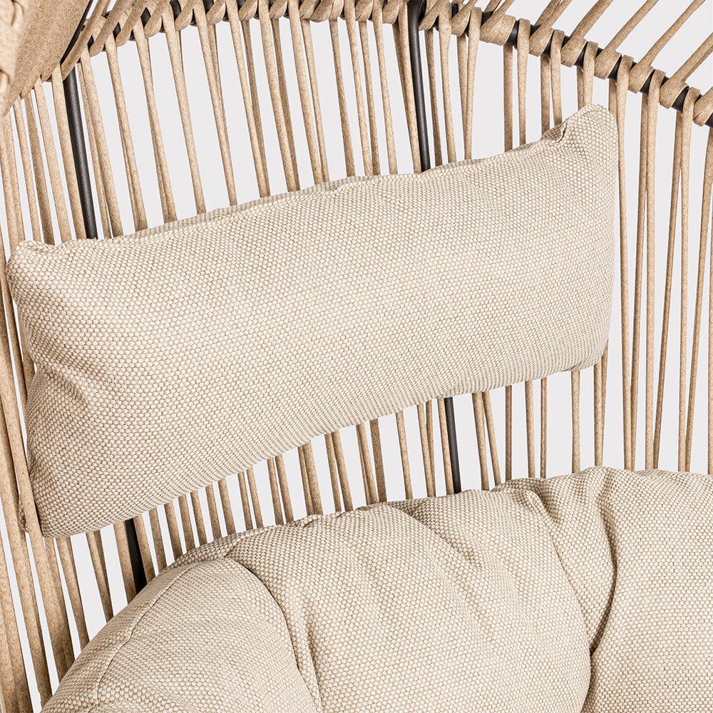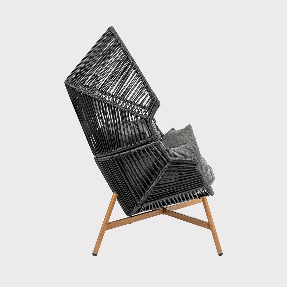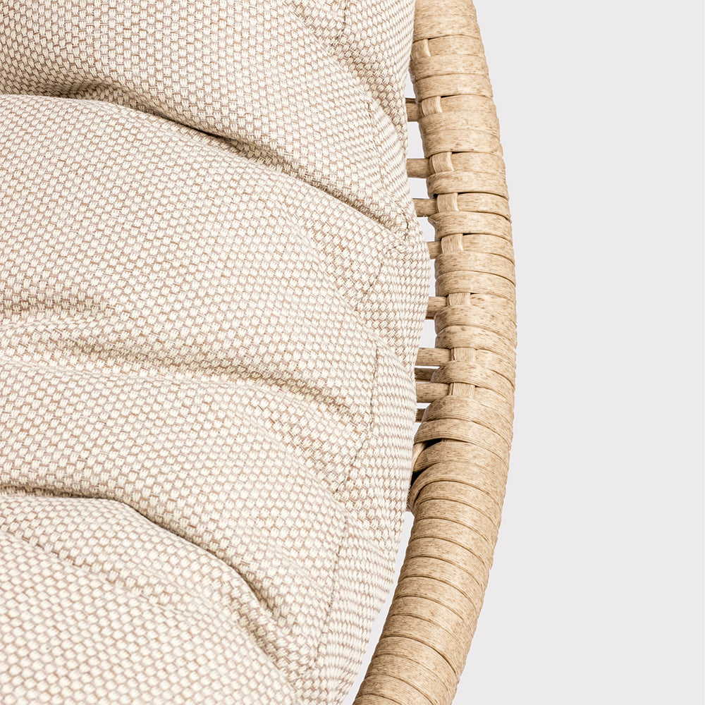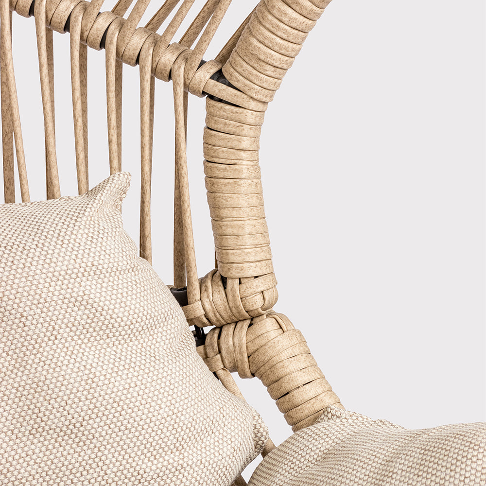 Fotel ogrodowy dla jednej osoby, który łączy w sobie styl i wygodę. Optymalnie wyprofilowane siedzisko z miękkimi poduchami umożliwia komfortowy relaks. Zestawienie splotu polirattanowego z delikatnymi nóżkami w kolorze drewna jest eleganckie i ponadczasowe.