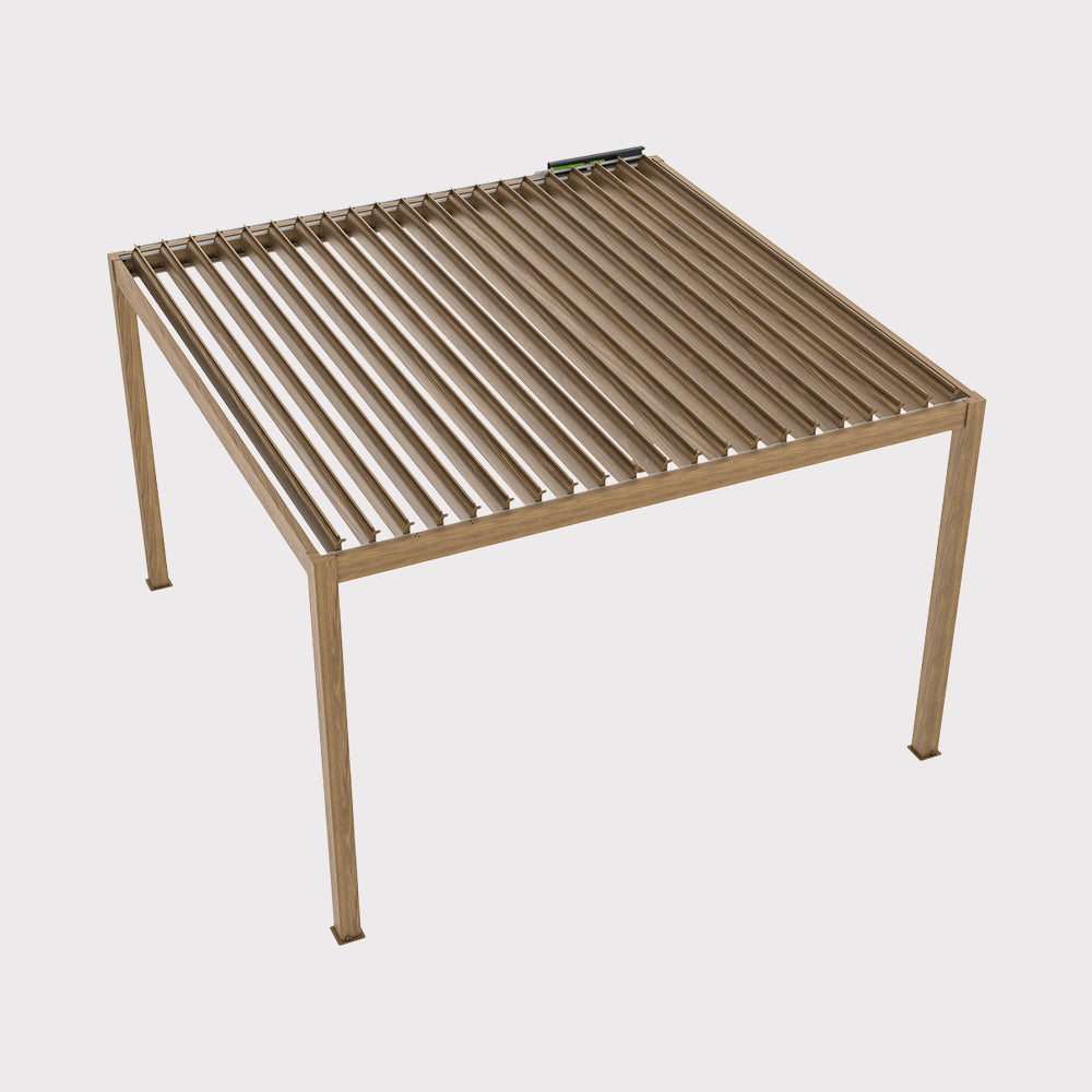 Pergola ogrodowa Luxe 4×4 m to połączenie nowoczesnej technologii i eleganckiego designu. W całości wykonana z aluminium, wyróżnia się odpornością na korozję, trwałością oraz estetycznym wykończeniem w kolorze drewna. Dach z aluminiowych paneli otwierany jest elektrycznie za pomocą pilota, co pozwala szybko dopasować stopień zacienienia do aktualnych potrzeb. Wbudowane oświetlenie LED tworzy nastrojową atmosferę, idealną zarówno na wieczorne spotkania, jak i codzienny relaks. Pergola wyposażona została w system odprowadzania wody, a stabilna konstrukcja z możliwością mocowania do podłoża gwarantuje bezpieczeństwo użytkowania. To wyjątkowa propozycja, która nada tarasowi lub ogrodowi nowoczesny, prestiżowy charakter.