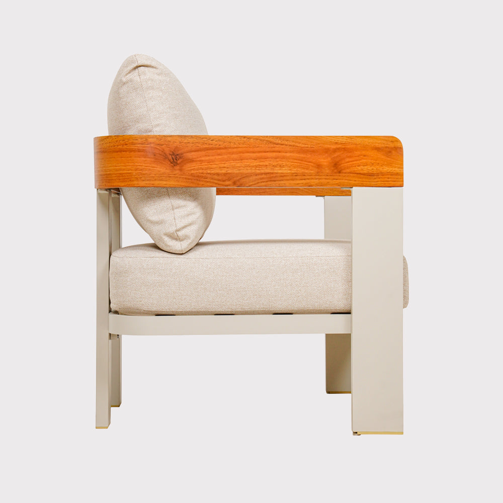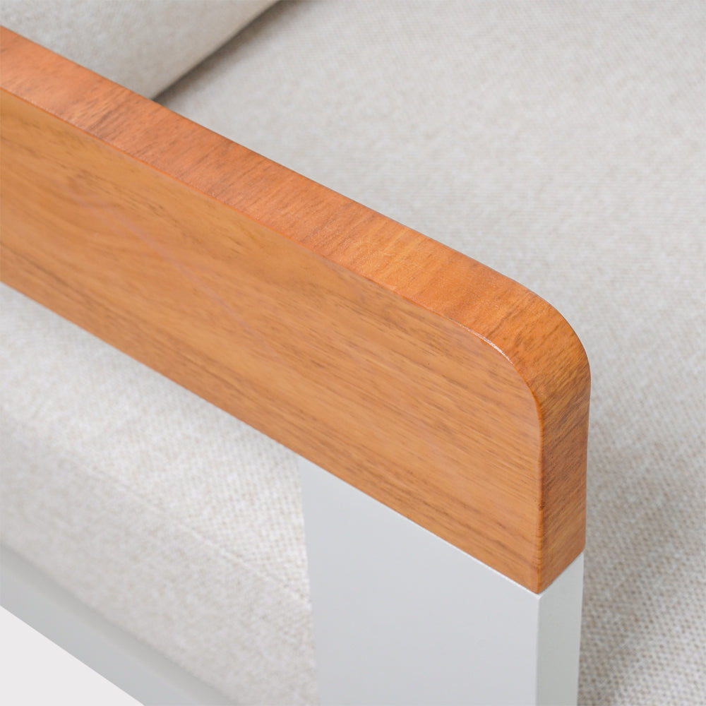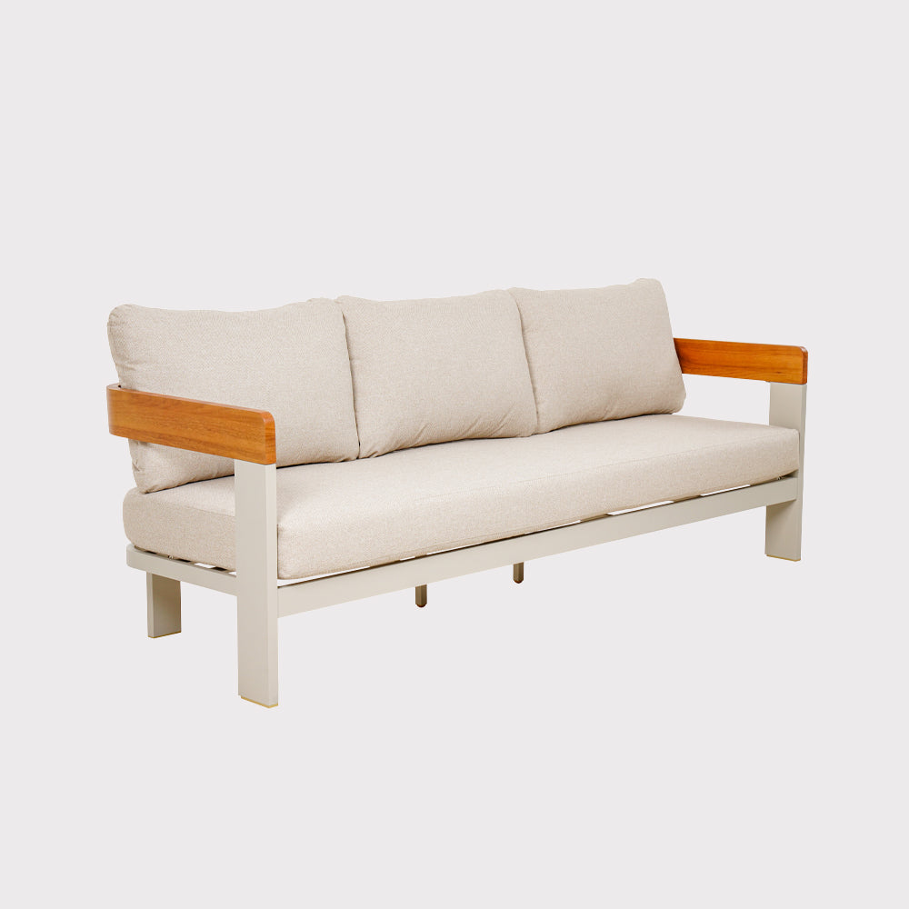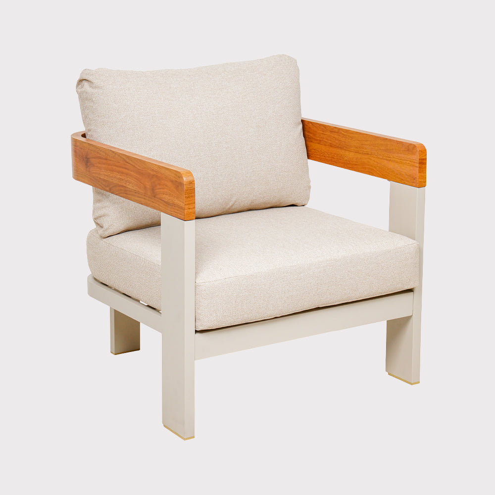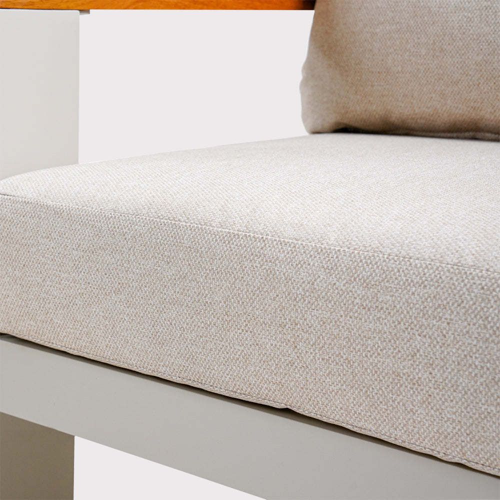 Zestaw Molto łączy elegancki, minimalistyczny design z funkcjonalnością, idealnie wpasowując się w nowoczesne przestrzenie zewnętrzne. Wyposażony w wygodne poduszki, zapewnia komfortowy relaks na świeżym powietrzu. Prosta, aluminiowa konstrukcja, malowana proszkowo, gwarantuje trwałość i odporność na warunki atmosferyczne. Dodatkowym atutem są elementy imitujące drewno na podłokietnikach i stole, które nadają całości ciepłego, naturalnego charakteru.