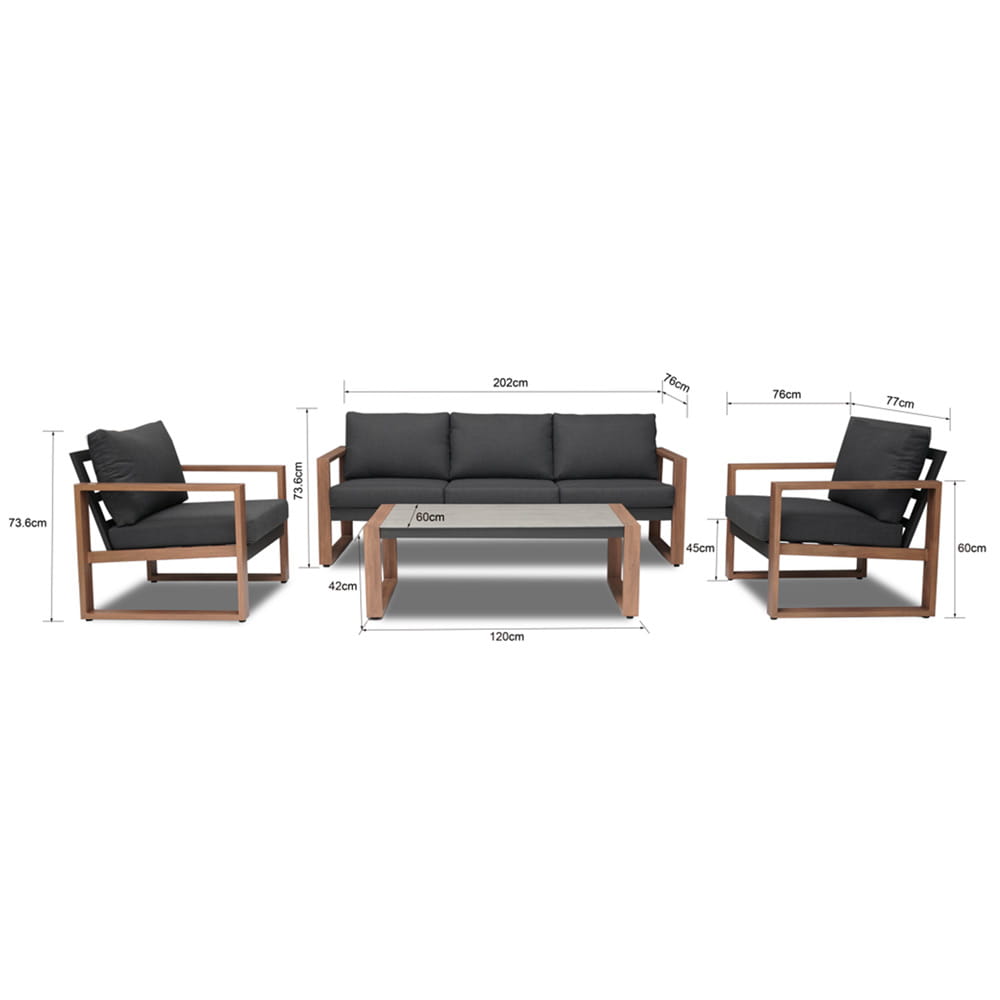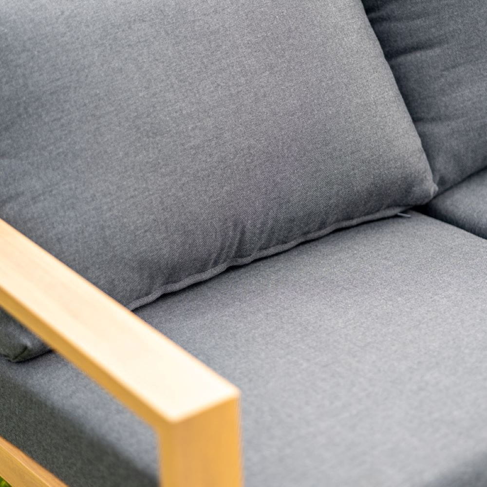 Zestaw mebli ogrodowych Duisburg CS to nowoczesna interpretacja klasycznej strefy relaksu. Minimalistyczny design, aluminiowa konstrukcja i detale w kolorze naturalnego drewna tworzą elegancką kompozycję, która łączy estetykę z funkcjonalnością. Komplet przeznaczony dla 5 osób obejmuje sofę trzyosobową, dwa fotele oraz stolik kawowy, zapewniając komfortowy wypoczynek w ogrodzie lub na tarasie.