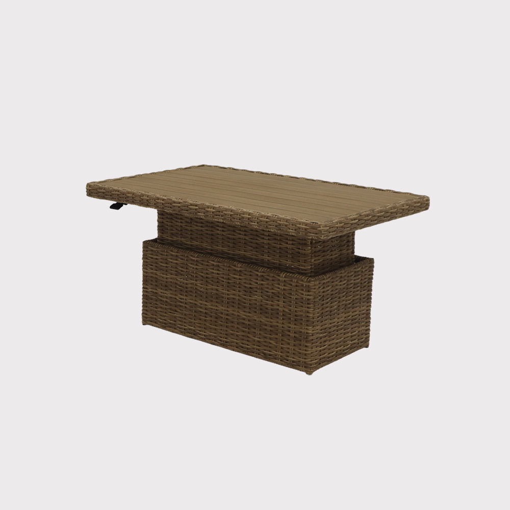 Zestaw mebli ogrodowych Porto to esencja nowoczesnego designu i wygody. Połączenie lekkiej aluminiowej konstrukcji z wykończeniem przypominającym naturalny rattan tworzy elegancką, a zarazem przytulną przestrzeń relaksu. W zestawie znajdują się dwie wygodne sofy - jedna z praktycznym stolikiem bocznym - oraz stół z regulowanym blatem, idealny zarówno na poranną kawę, jak i długie wieczorne rozmowy. Miękkie poduszki w subtelnym kolorze zapraszają do odpoczynku, zapewniając wyjątkowy komfort każdego dnia.