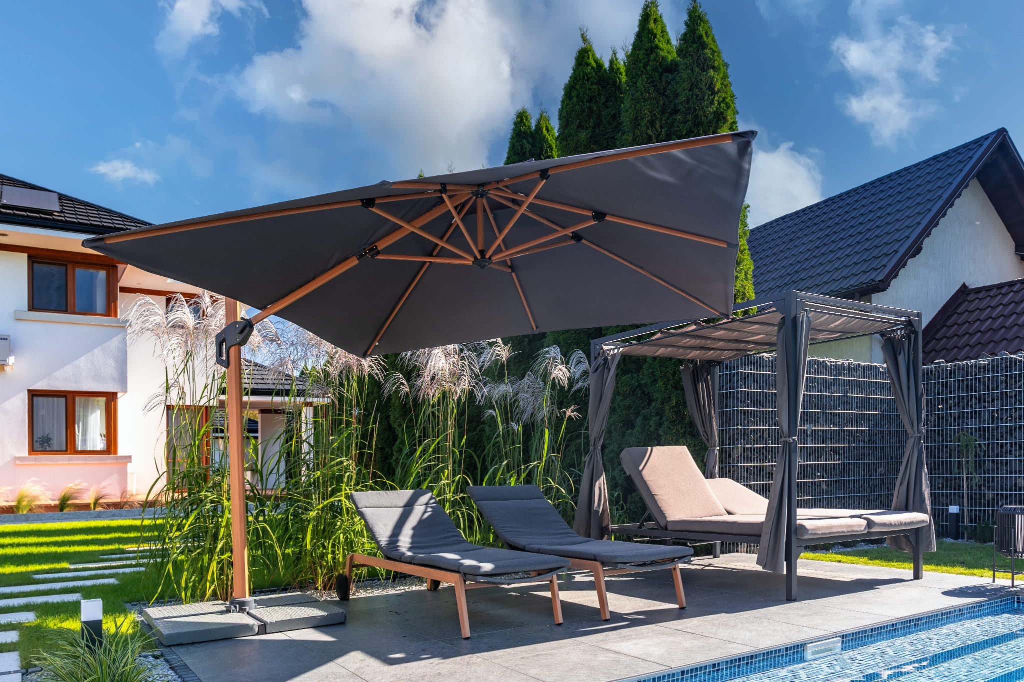 This large garden umbrella with a square canopy and aluminum pole offers a robust design that's perfect for any garden. Its multi-level adjustments allow it to be tailored to the individual needs of its users.