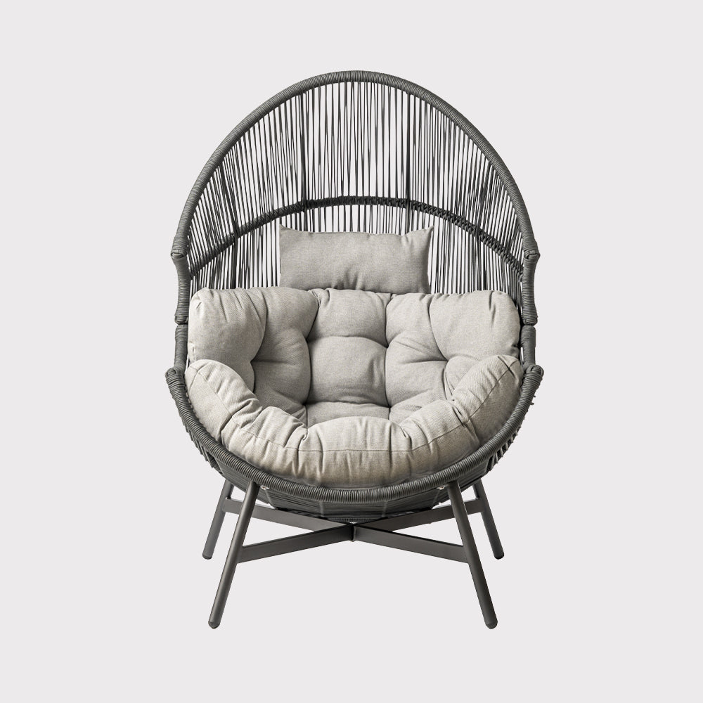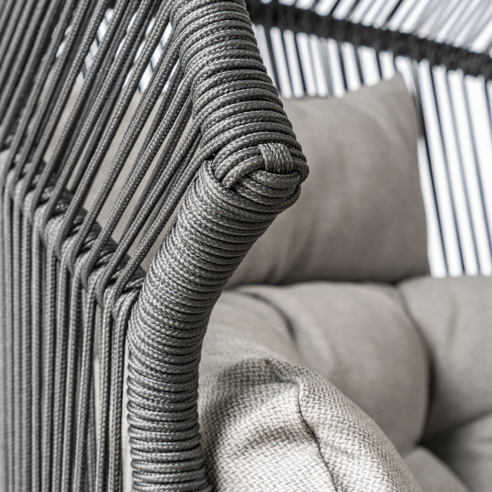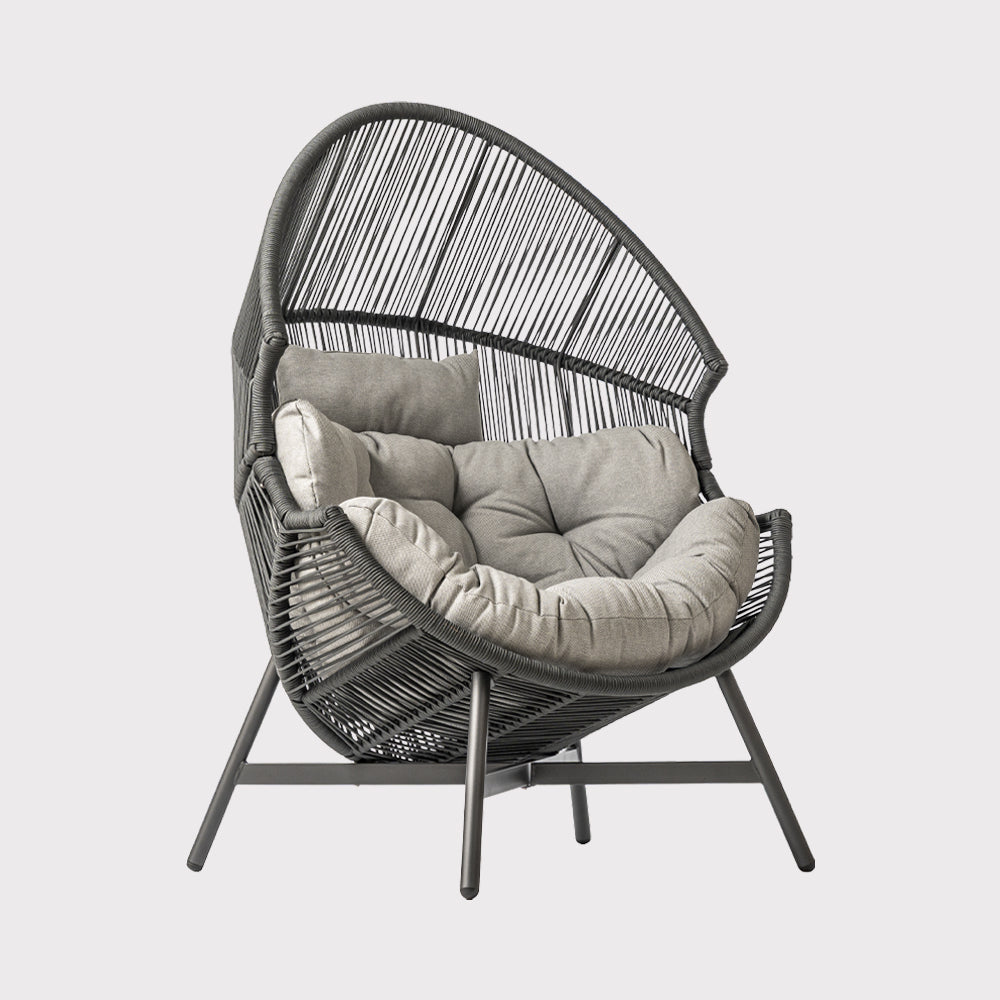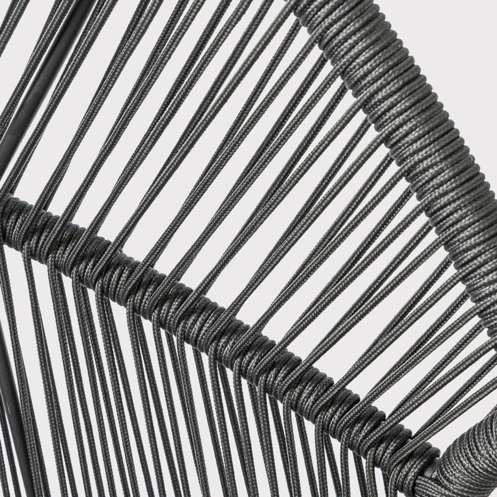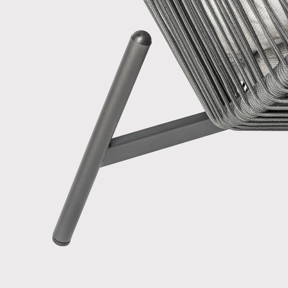 The HOLA garden chair in gray combines a modern, openwork design with the comfort of everyday use. Its black powder-coated steel frame ensures stability and durability while maintaining a lightweight appearance. The gray cord seat creates a subtle weave effect that perfectly complements the aesthetics of contemporary gardens and patios. Soft spun polyester fabric cushions in a matching gray shade complement the design, enhancing seating comfort and promoting extended relaxation. The chair's proportions allow for comfortable use in the garden, on the patio, in covered relaxation areas, or in modern conservatories. The HOLA model works well as a standalone accent piece or as part of a larger lounge suite, adding a calm, elegant character and a pleasant, relaxing atmosphere.