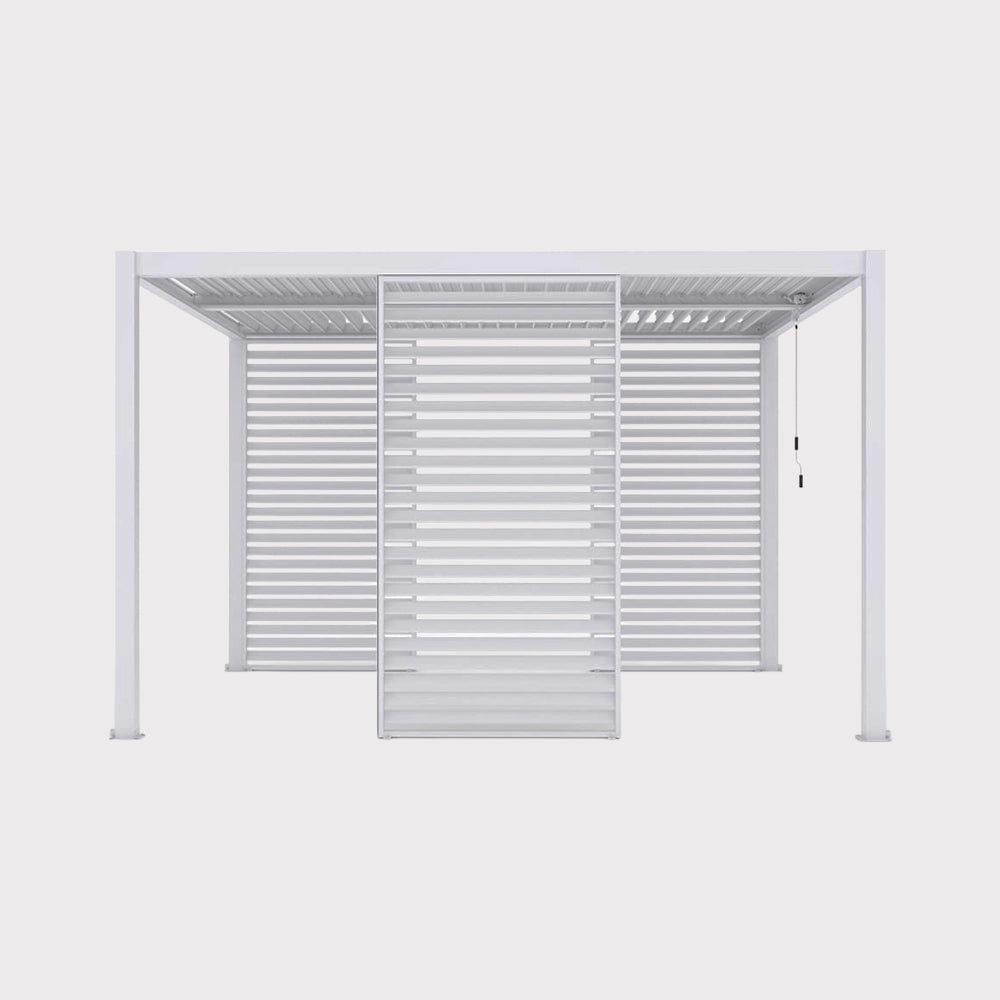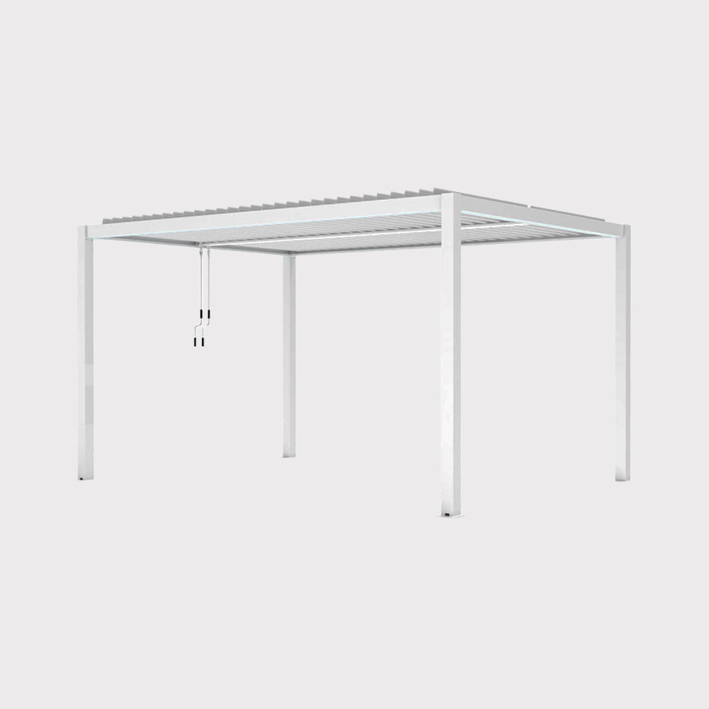 The Luxe 3x4m white garden pergola is an elegant canopy that combines modern design with high functionality. The robust aluminum structure is resistant to corrosion and changing weather conditions, ensuring durability for many seasons. The manually adjustable aluminum slat roof allows for smooth control of light and shade, while the division into two independent zones enhances the comfort of everyday use. The WaterSpill system drains rainwater inside the posts, making the pergola even more practical. An additional advantage is the LED lighting, which creates a cozy atmosphere after dark and makes the pergola an ideal place for relaxation and socializing.