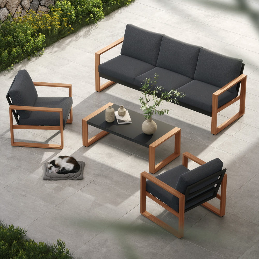 The Duisburg CS garden furniture set is a modern interpretation of a classic relaxation area. Minimalist design, aluminum construction, and natural wood details create an elegant composition that combines aesthetics with functionality. Designed for five people, the set includes a three-seater sofa, two armchairs, and a coffee table, ensuring comfortable relaxation in the garden or on the terrace.