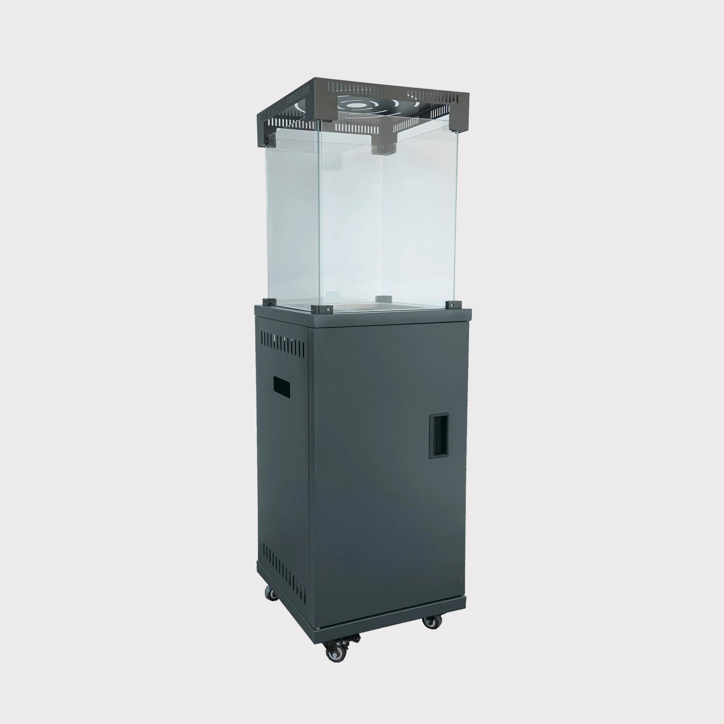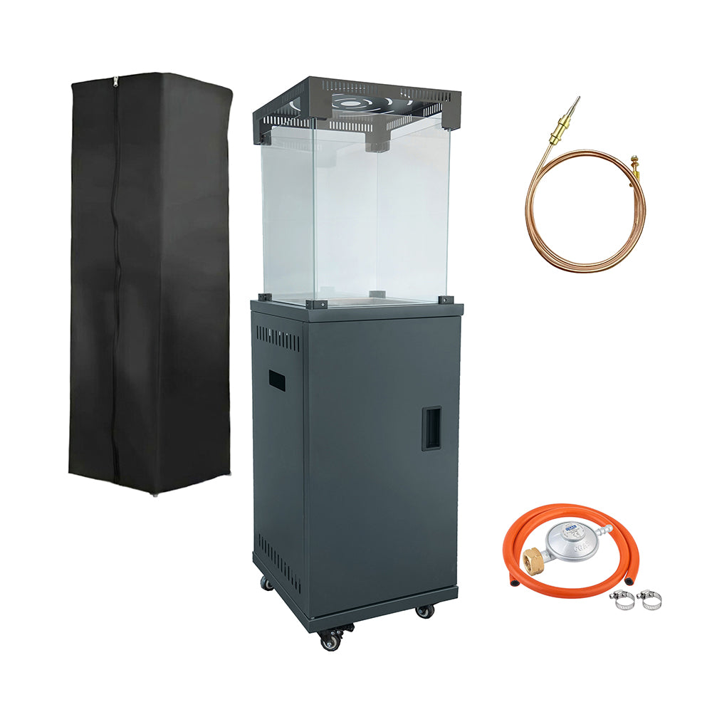 Tarasowy ogrzewacz gazowy to funkcjonalne i estetyczne rozwiązanie, które pozwala komfortowo korzystać z przestrzeni zewnętrznej nawet w chłodniejsze dni. Nowoczesna forma w kolorze antracytowym dobrze komponuje się z aranżacją tarasu i ogrodu, a widoczny płomień zamknięty w szklanej osłonie tworzy przyjemny klimat sprzyjający relaksowi. Ogrzewacz wyposażony został w stabilną konstrukcję z kwadratową podstawą oraz dolnymi wspornikami, które zwiększają bezpieczeństwo użytkowania. Szklana osłona przeciwwiatrowa chroni płomień przed podmuchami, a dołączona skała lawowa wspiera równomierne oddawanie ciepła.