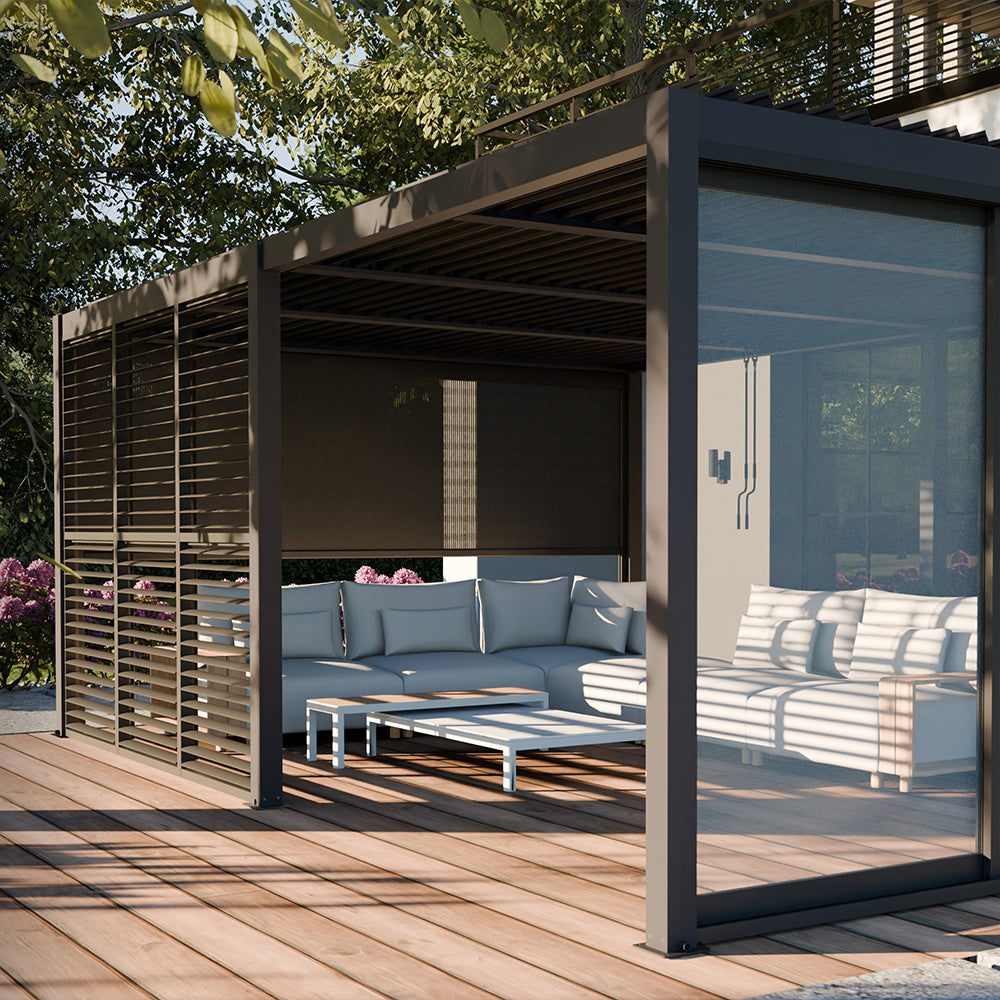Pergola LUXE w formacie 5,8 × 4 m to propozycja dla osób, które chcą stworzyć komfortową, nowoczesną przestrzeń wypoczynkową o wyraźnie reprezentacyjnym charakterze. Jej proporcje pozwalają zaaranżować zarówno dużą strefę jadalnianą, jak i rozbudowaną część relaksu z sofami, leżakami czy oświetleniem dekoracyjnym. Antracytowa konstrukcja nadaje całości elegancki, architektoniczny wygląd i doskonale komponuje się z nowoczesnymi elewacjami oraz minimalistycznymi ogrodami.